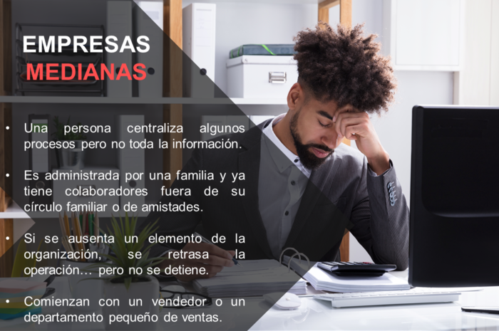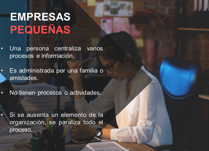 En las empresa grandes se tiene ya estructuradas las áreas y procesos... estos estos procesos de información no tienen una estructura definida, no hay un puesto, departamentos de ventas; El dueño o socio fundador es el que compra, el que vende, el que atiende a proveedores, el que atiende la logística, el que se va a almacén, etc, esto provoca que solo una o dos personas puedan obtener toda la información.