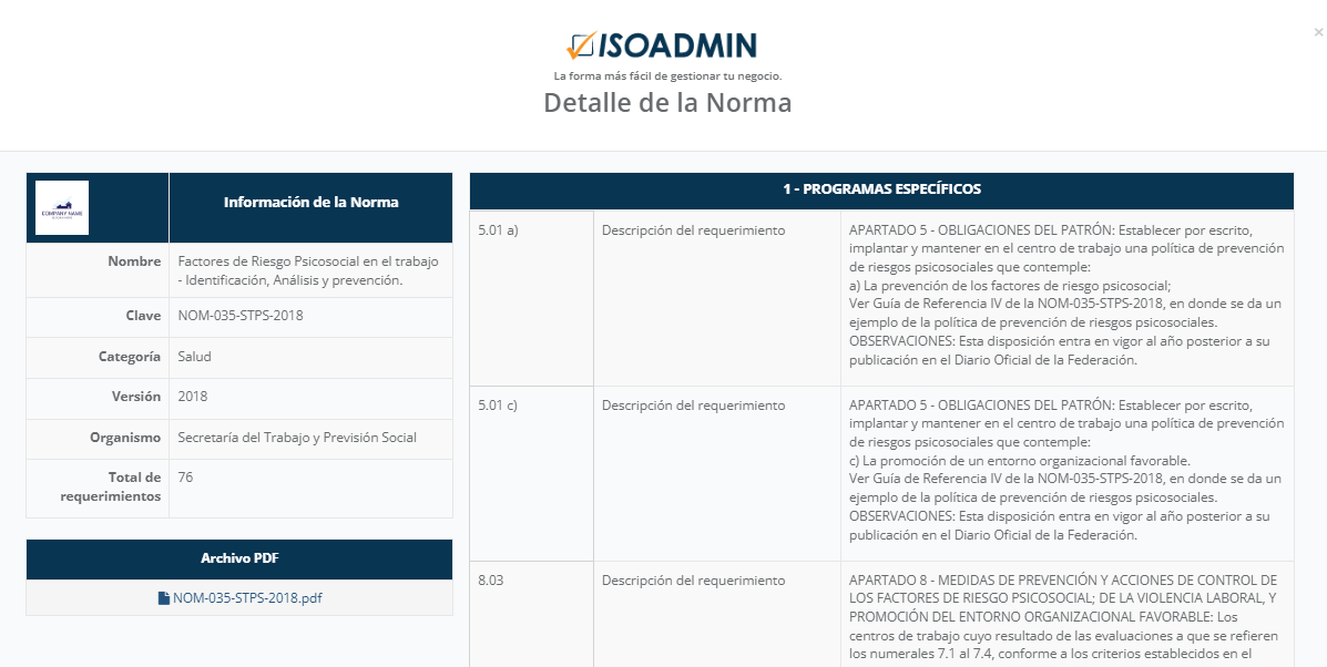 Con ISOADMIN puedes realizar la implementación y cumplimiento de un EOF dentro de tu empresa o centro de trabajo de manera fácil y total mente optimizada, ya que cuenta con el módulo de normas, incluyendo la NOM-035-STPS-2018 en donde encontrarás a detalle los requerimientos a cumplir... Solicita tu DEMO de manera gratuia y comienza a implementar la normatividad STPS.